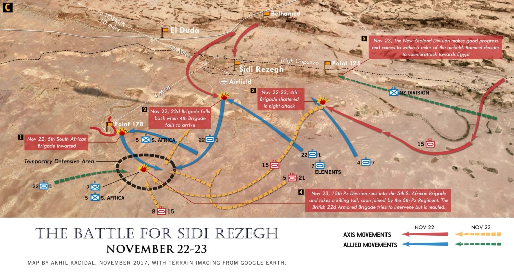 From Wikipedia on the battle on 23rd November 1941: By 1315 a major tank battle was underway between Axis forces and 7 Armoured Division. At 1555 – 1st SA Division were passing a signal to 5 SA Brigade when the brigade interjected “wait…..” Those were the last words received from the 5th SA Infantry Brigade. Some units retained some form of unity and managed to escape east through the New Zealand and Indian fronts. Against the German tanks, the South African infantry had no real means of defence with limited Anti-Tank capabilities, they were compelled to use 25-pounders in a direct fire role. By the time the panzers had broken into the rear of the brigade, the artillery had been subdued and all anti-tank capabilities had been destroyed. By nightfall, all that remained of 5 SA Brigade was “…little groups of disconsolate prisoners…..between frequent flares and the light of burning ammunition.” “The 5th SA Brigade had been caught by an overwhelming force in the open desert, quite unprepared and without inflicting any negligible damage on its opponents.” The battle had resulted in a victory for the Afrikakorps, but the 7th Armoured and 1st South African Divisions had not been annihilated and the loss of the 5th SA Brigade was not enough to set off the loss of almost 50% of the Afrikakorps tanks which went into battle. At 0100 on 24 November, Brigadier Brink reported to XXX Corps that 5th SA Brigade had “ceased to exist as a fighting formation.”